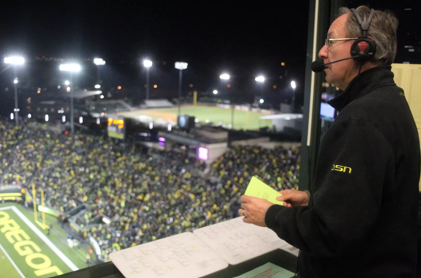 Jerry Allen, the "Voice of the Ducks," offensive lineman Michael DeLaGrange, and soccer goalkeeper Sarah Peters, have been selected to receive the UO Athletics' distinguished alumni awards. Photo by Geoff Thurner, Copyright 2012