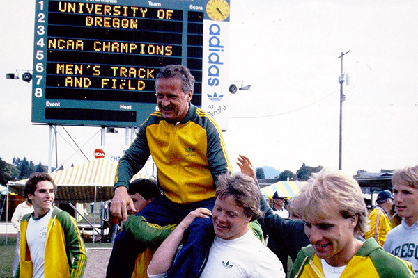 Dellinger’s savvy and consistent leadership continued for nearly three decades at Oregon, bringing ongoing success. A career highlight was the 1984 men’s track team, which won the NCAA team title as underdogs in dramatic fashion at Hayward Field. Dellinger’s team included a unique combination of highly-touted and under-the-radar athletes, including eventual Olympic Gold Medalist Joaquim Cruz, class of 1985, and future Olympians Brian Crouser, BS ’86 (community health) and Ken Flax, BS ’87 (psychology). Going into the men’s 1,500 on the last day, Oregon held a narrow lead. Dellinger quietly watched Oregon’s two runners toe the line as the packed Hayward crowd roared.