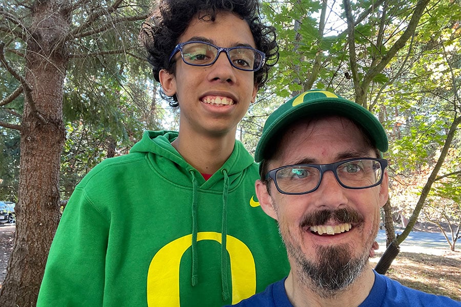 When Matthew Bates, BA ’96 (magazine journalism), told his son, Noah, to “find his school,” he never expected that Noah would choose his alma mater. But Noah fell in love with the Eugene campus and is now entering his first year at the UO studying planning, public policy and management. “I never thought about the idea that he might come here . . . and the fact that he’s going to be going to the same school that I was going to, studying in the same buildings, it just feels like there’s a bond there I was pleasantly surprised and excited about that we’re going to get to have,” Matthew says.