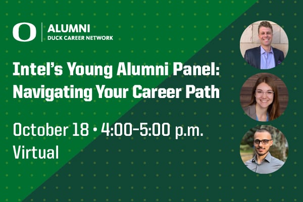 Hear from three young alumni making an impact at Intel Corporation. This moderated discussion covers topics ranging from navigating your first job out of college and avoiding imposter syndrome, to removing the intimidation factor from networking. Laurin Maurer, Vivek Sharma and moderator Max Green look forward to sharing their advice with fellow Ducks, no matter the major or career focus.