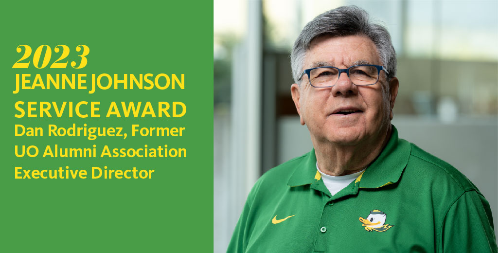 This award is named after Jeanne Johnson, who dedicated years of her life to serving the UO Alumni Association (UOAA) in a number of roles. Her service laid the foundation for the UOAA to expand by helping more alumni strengthen their relationships with each other and the UO. This award recognizes individuals who, like Jeanne Johnson, have gone above and beyond in dedicating extraordinary service to the UO Alumni Association. Past recipients include Len Casanova, Teresa Giustina, MS ’86; Corey duBrowa, BA ’88; and Cheryl Ramberg Ford.