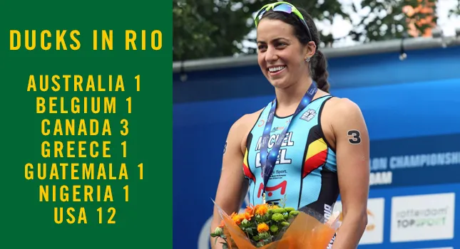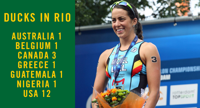 Belgian triathlete Claire Michel, BA '11 (pictured) is one of twenty current and former Ducks competing in Rio at the 2016 Olympic Games. There are more Ducks in Rio than there are athletes from 117 other National Olympic Committees, including Pakistan (population 202 million), Bangladesh (171 million), the Philippines (100 million), and Sri Lanka (20 million); and in addition to track and field Ducks will be seen in rugby sevens, men's basketball, and women's triathlon. (Photo courtesy Claire Michel)