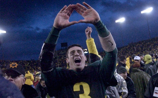 Joey Harrington famously threw the 'O' to signal the band to play "Mighty Oregon," the university's fight song, which will celebrate its 100th birthday on March 10, 2016.