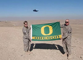 Maj. Gen. Tammy Smith displays a UO flag in Afghanistan