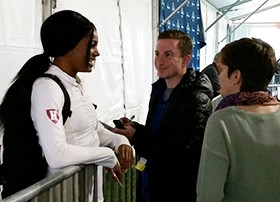 Behind the west grandstand, UO head coach Robert Johnson and the members of his championship clinching 4x400 relay team headed to the safety of the media tent to dry off and face the assembled journalists—a crowd that included students from journalism professor Lori Shontz's track and field writing class.