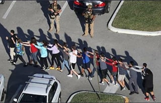 Terrified students from Stoneman Douglas High School in Parkland, Florida, walking through the parking lot with their hands on their heads, while 17 friends lie dead inside the school’s classrooms.