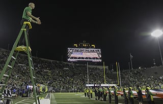 This spring, the School of Music and Dance hired Dennis Llinás to be the university’s new director of bands. The former head of LSU’s Sudler Trophy-winning Golden Band from Tigerland, Llinás oversees all bands at the UO and conducts the wind ensemble. This fall he also conducted the Oregon Marching Band during the playing of the Star Spangled Banner before each football game in Autzen Stadium.