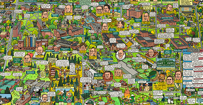 Visit the original in the EMU or survey all the puns, jokes, and history trivia with your own limited-edition, signed print, on sale for $269 each at the Duck Store and uoduckstore.com/alumniprint.