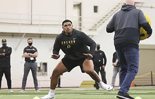 Penei Sewell works out at the UO's pro day on April 2. Photo by Eric Evans.