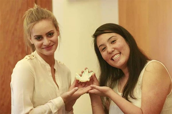 Deema Yusuf (left) and Yaara Tal (right) pictured together with a modern symbol of peace – the dove.
