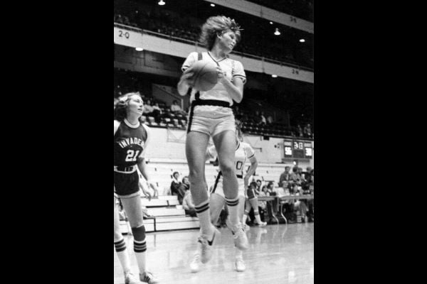 University of Oregon basketball player Bev Smith coming down with a rebound in a game played at McArthur Court in the late 1970s. Photo Credit: Oregon Digital Archives
