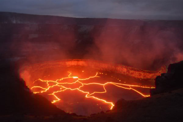 UO researcher Leif Karlstrom BMus ’06 (music performance), BS ’06 (mathematics), and Josh Crozier, PhD ’21 (earth sciences), give new insight into the lava pool and underlying magma chamber in Hawaii.