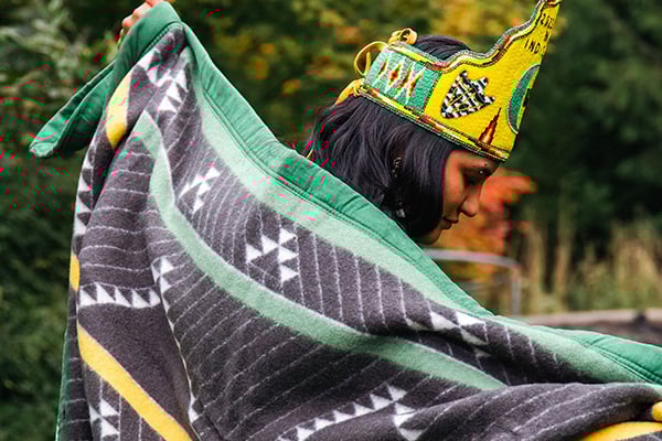 Modeling the Home Flight blankets is Miss Indigenous UO, Keyen Singer (Confederated Tribes of the Umatilla Indian Reservation), a sophomore studying environmental studies.