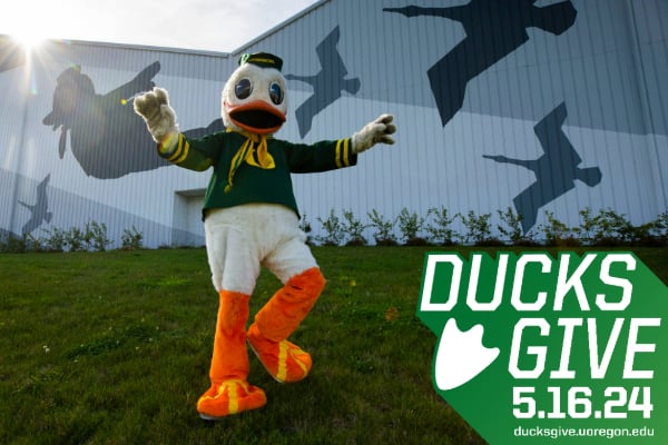 Ducks Give goes live at noon on May 15 and closes at 11:59 p.m. on May 16. To stay updated, Beck encourages visiting the Giving Day website, keeping tabs on the UO and UO Alumni Association’s social media channels and using #DucksGive on social media. To play a more active role, sign up to become a Ducks Give ambassador and download graphics to use on your social media channels.