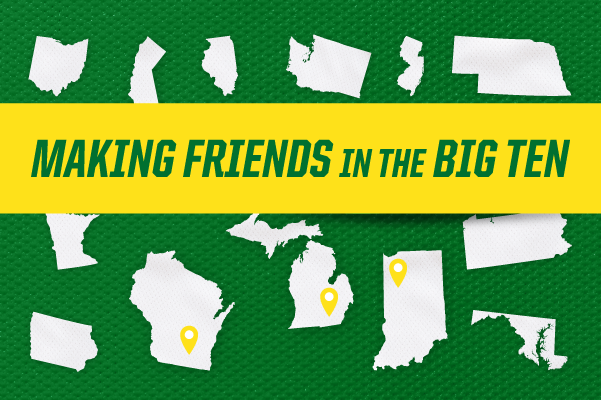 Whether or not you’re planning on joining the football team in the Midwest this fall, we want to help you get to know our new neighbors in the Big Ten, especially the ones who will be hosting a flock of Ducks fans this football season at away games in Indiana, Michigan, and Wisconsin.
