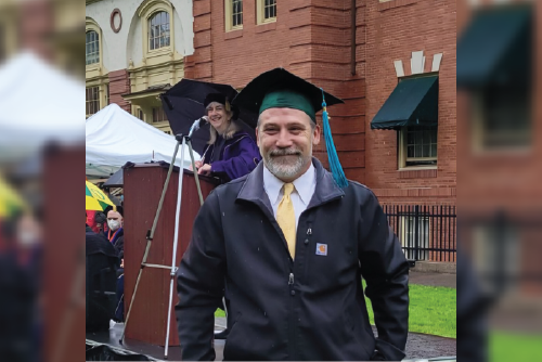 Rick Zylstra celebrates earning his master's degree in community and regional planning on commencement day 2022. Photo courtesy: Rick Zylstra