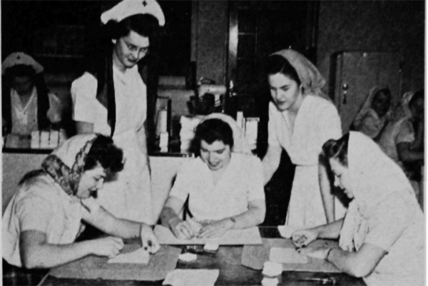 Veteran Bandage-rollers pictured at the campus Red Cross headquarters are, left to right, Betty Lawrence, Anne Graham, Leslie Brockelbank, Carol Wicke, and June Grantz. Women's living organizations stage a contest each week to determine which house puts in the most hours at Red Cross.