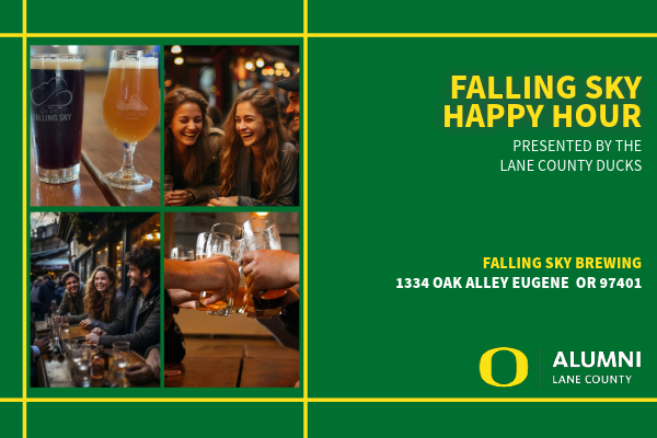 Whether you graduated recently or have been out in the professional world for a while, this is the perfect opportunity to reconnect, share stories, and make new memories with fellow University of Oregon alumni in Lane County. This event will take place at Falling Sky Brewing and will be a relaxed and fun atmosphere for old and new friends to reconnect, network, and have fun. Appetizers will be provided!