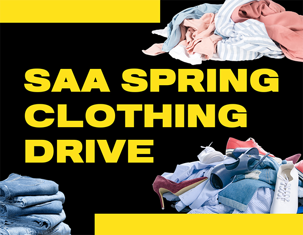 Spring into action and donate your clothes. The SAA is seeking donations of gently used clothing for all ages. The clothes will be donated to the Reusable Office Supply Exchange (ROSE) Room.
